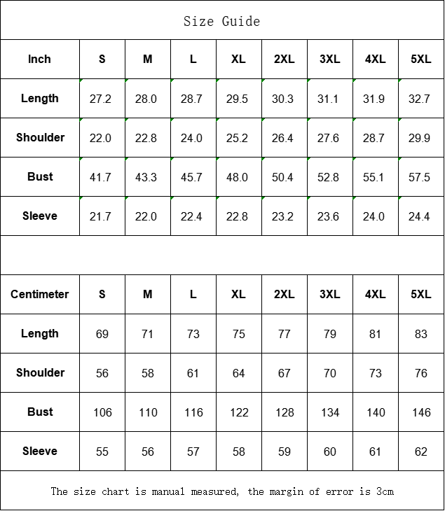 | Centimeter | S | M | L | XL | 2XL | 3XL | 4XL | 5XL |